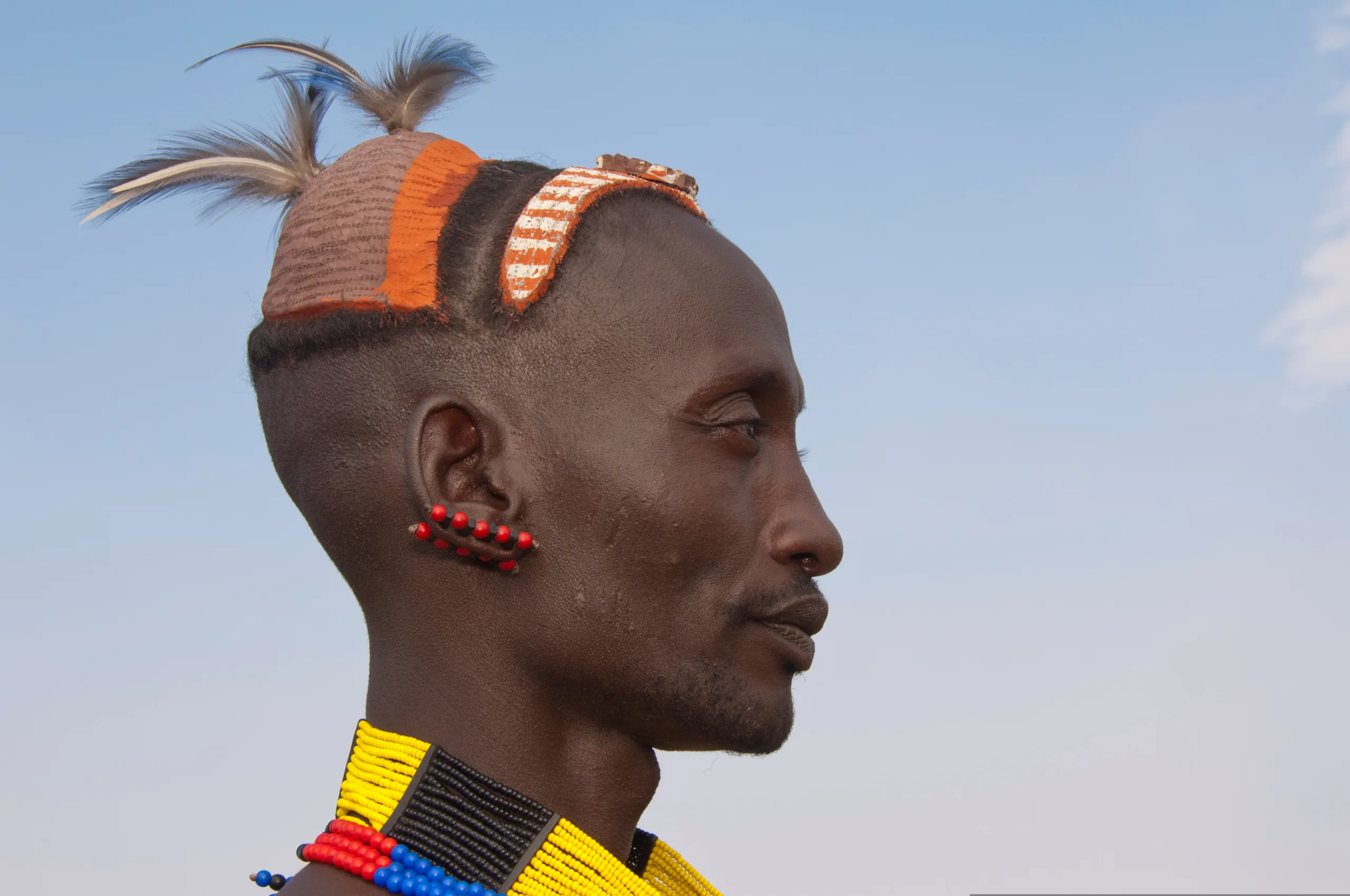 This day morning, we continue through the savannah along tracks that are barely visible, passing through a vast meadowland with shrubs and umbellifers (‘umbrella’ acacia trees) for an excursion to the Murulle area. We arrive at Korcho village with beautiful views over the Omo River to see the Karo ethnic group, experts in body painting, using clay and locally available vegetable pigments to paint fantastic patterns on each other’s faces, chests, arms and legs. These designs have no special symbolic significance, but are created purely for fun and aesthetic effect, each artist vying to out-do their fellow artists. Karo men also sculpt and shave their hair into extravagant shapes, with special ochre “caps” of hair usually containing several ostrich feathers.